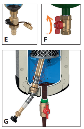 Komora gromadzenia zanieczyszczeń wyposażona jest w kulowy zawór spustowy z dźwignią w wersji gwintowanej (E), oraz motylkowy kulowy zawór spustowy w wersji kołnierzowej (F). Zawory te mogą być użyte do usunięcia zanieczyszczeń zgromadzonych w komorze nawet w czasie normalnej pracy instalacji. W wersji z magnesem czyszczenie może być przeprowadzone po usunięciu magnesu (G i H). W wersji kołnierzowej magnes może być wyjęty po odkręceniu pokrętła (G), aby ułatwić tą procedurę element magnetyczny w tej wersji składa się z kilku części.