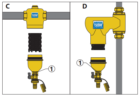 Aby przeprowadzić prace konserwacyjne (w wersji gwintowanej dla rur poziomych) (C) wystarczy odkręcić komorę zbierającą zanieczyszczenia za pomocą sześciokątnego klucza (26 mm). W tej wersji możliwe jest usunięcie wewnętrznego elementu. W przypadku urządzeń dla rur pionowych (D) możliwe jest jedynie odkręcanie komory zbierającej zanieczyszczenia (element wewnętrzny nie może zostać usunięty).
