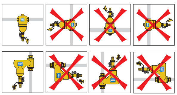 Separator zanieczyszczeń powinien być zainstalowany na przewodzie powrotnym przed kotłem. Pozwala to na separacje zanieczyszczeń przy pierwszym uruchomieniu zanim dotrą one do kotła. Urządzenia tego typu należy montować w pozycji pionowej i najlepiej po stronie ssącej pompy. Dostępne są wersje do montażu na rurociągach pionowych i poziomych. Kierunek przepływu nie ma wpływu na prawidłową pracę urządzenia. Dla serii 5466 należy zapewnić minimum 16 cm wolnej przestrzeni pod urządzeniem w celu usunięcia elementu magnetycznego.