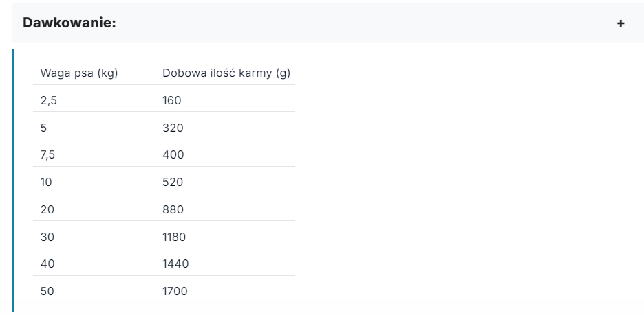 Skład: łosoś (30 %), indyk (26 %), ryż (4 %), jabłka (3 %), mąka grochowa, olej rybny (1 %), lignoceluloza, hydrolizowane drożdże (0,5 %), łuski i nasiona psyllium ( 0,5 %), chlorek potasu, chlorek sodu, węglan wapnia, juka Mojave (0,1 %), mannooligosacharydy (0,004 %), β-glukany (0,005 %), fruktooligosacharydy (0,002 %). Wysokostrawne źródła składników: łosoś, indyk, ryż.