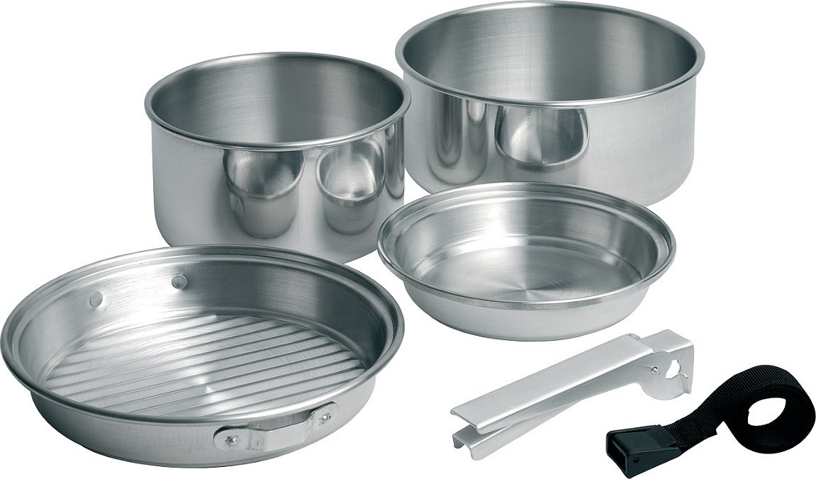 Zestaw naczyń turystycznych umożliwiający wygodne gotowanie w terenie. Idealny dla miłośników bushcraftu, survivalu i outdooru. Naczynia zostały wykonane z aluminium, które charakteryzuje się lekkością i wysoką wytrzymałością na uszkodzenia. Zaletą produktu są również uchwyty, dzięki którym garnki można bezpiecznie podnieść z ognia. Garnki mają różny rozmiar, co ułatwia zarówno gotowanie, jak i przenoszenie zestawu. Dzięki dołączonemu paskowi naczynia można złożyć uzyskując niewielkich rozmiarów pakunek, a transport ułatwi uchwyt. W zestawie znajduje się poliestrowy pokrowiec.