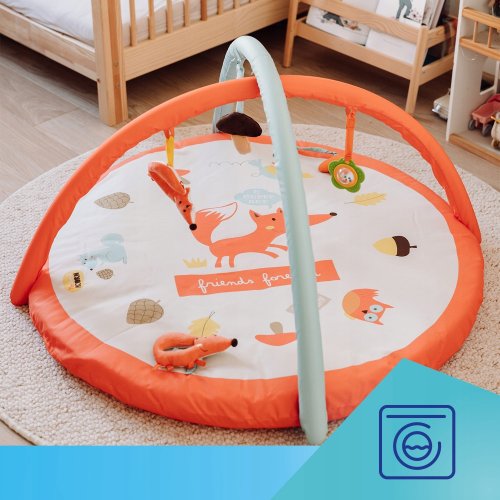 Mata edukacyjna FOX wspiera rozwój zmysłów dziecka poprzez różnorodne tekstury, dźwięki i kolory. Grzechotki, piszczałki oraz elementy szeleszczące angażują zmysł słuchu, a różnorodne faktury wpływają na zmysł dotyku. Dodatkowo, lusterko umieszczone na macie zachęca do leżenia na brzuszku, co wspiera rozwój umiejętności motorycznych.