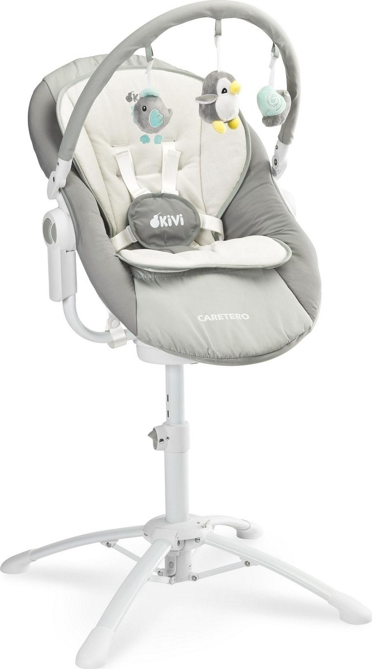 Krzesełko Kivi to nowoczesny produkt łączący w sobie 3 cechy -wysokiego krzesełka, leżaczka i huśtawki niemowlęcej. Posłuży dzieciom od urodzenia (funkcja huśtawki 0-9 kg, funkcja leżaczka 0-12 kg), aż do osiągnięcia wagi 15 kg (funkcja krzesełka do 15 kg). Dzięki niemu, możesz mieć maluszka cały czas w zasięgu wzroku. Wariant huśtawki posiada mechanizm bujania, funkcję wibracji oraz wbudowane melodie. Można sterować huśtawkę pilotem.