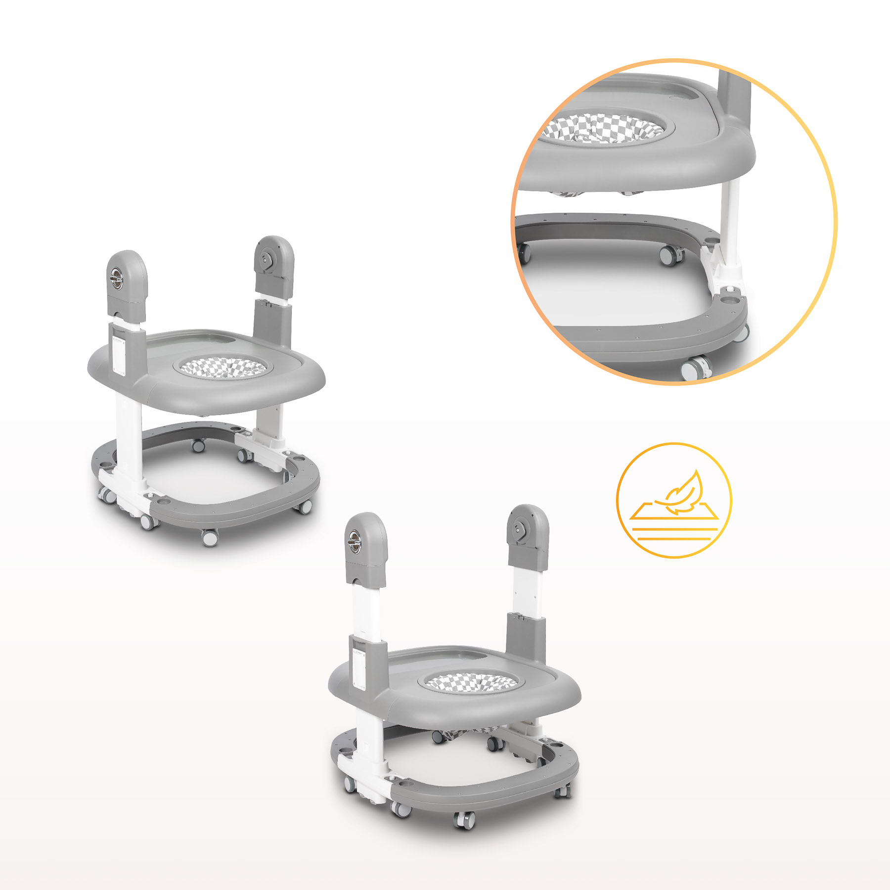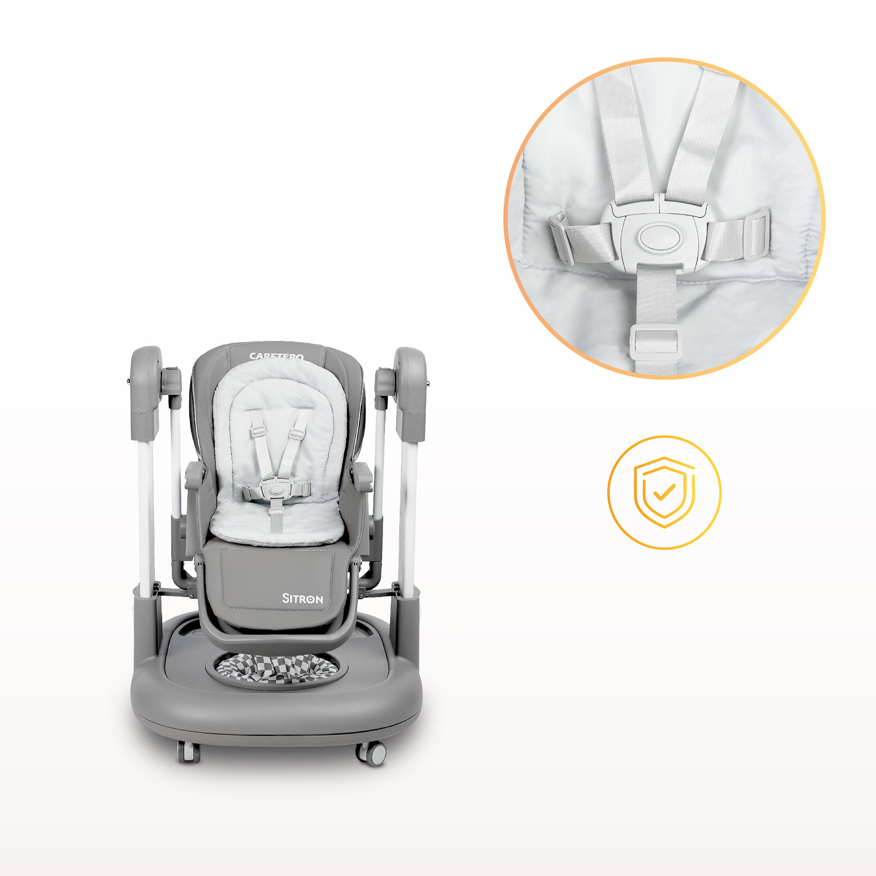 Dbamy o bezpieczeństwo Twojego dziecka na każdym etapie użytkowania. Krzesełko jest wyposażone w pasy bezpieczeństwa, które bezpiecznie utrzymują maluszka w foteliku, a blokowane koła zapewniają stabilność. Zaokrąglone krawędzie eliminują ryzyko urazów, zapewniając maluszkowi komfort i bezpieczeństwo.