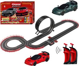 Carrera GO!!! to zestawy startowe do Świata Wyścigów Carrera. W jego skład wchodzą dwa auta Ferrari: Ferrari SF90 XX Stradale- Rosso Corsa i Ferrari SF90 XX Stradale- Grigio Scuro. Zestaw wyposażony jest w bezprzewodowy kontroler z turbo doładowaniem i zasilacz toru. Auta załączone w zestawie są w skali 1:43 i zostały wykonane z najwyższą dbałością o szczegóły.