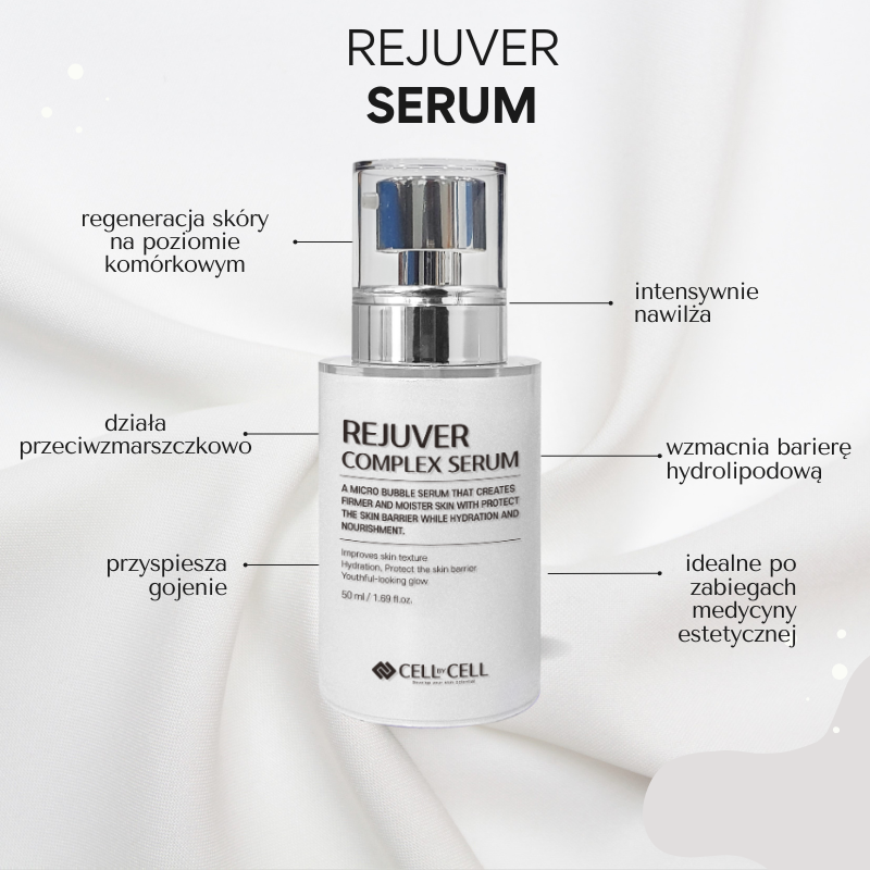 Cell by Cell Rejuver Complex Serum to skoncentrowany preparat przeciwstarzeniowy, dedykowany cerze dojrzałej oraz wymagającej intensywnej regeneracji. Formuła produktu opiera się na technologii mikropęcherzyków, która ułatwia transport składników aktywnych w głębsze warstwy naskórka. Serum nie tylko redukuje widoczność zmarszczek dzięki zaawansowanym peptydom, ale również stanowi skuteczne wsparcie w procesie gojenia skóry po inwazyjnych zabiegach kosmetycznych i medycyny estetycznej.