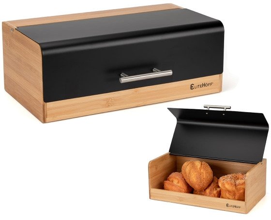 Nowoczesna forma chlebaka, jego efektowny kształt oraz połączenie metalu w czarnym kolorze z bambusem świetnie prezentują się na blacie. Specyfikacja: Korpus wykonany z drewna bambusowego. Pokrywa stalowa w kolorze czarnym Łatwe otwieranie. Oszczędność miejsca. Przeznaczony do przechowywania wszelkiego rodzaju pieczywa. Atrakcyjny, nowoczesny design. Wykonany z wysokiej jakości materiałów. Opakowanie: kolorowy karton. Kolor: czarny / jasne drewno. Wymiary chlebaka: Długość: 36 cm Szerokość: 20 cm Wysokość: 13,5 cm