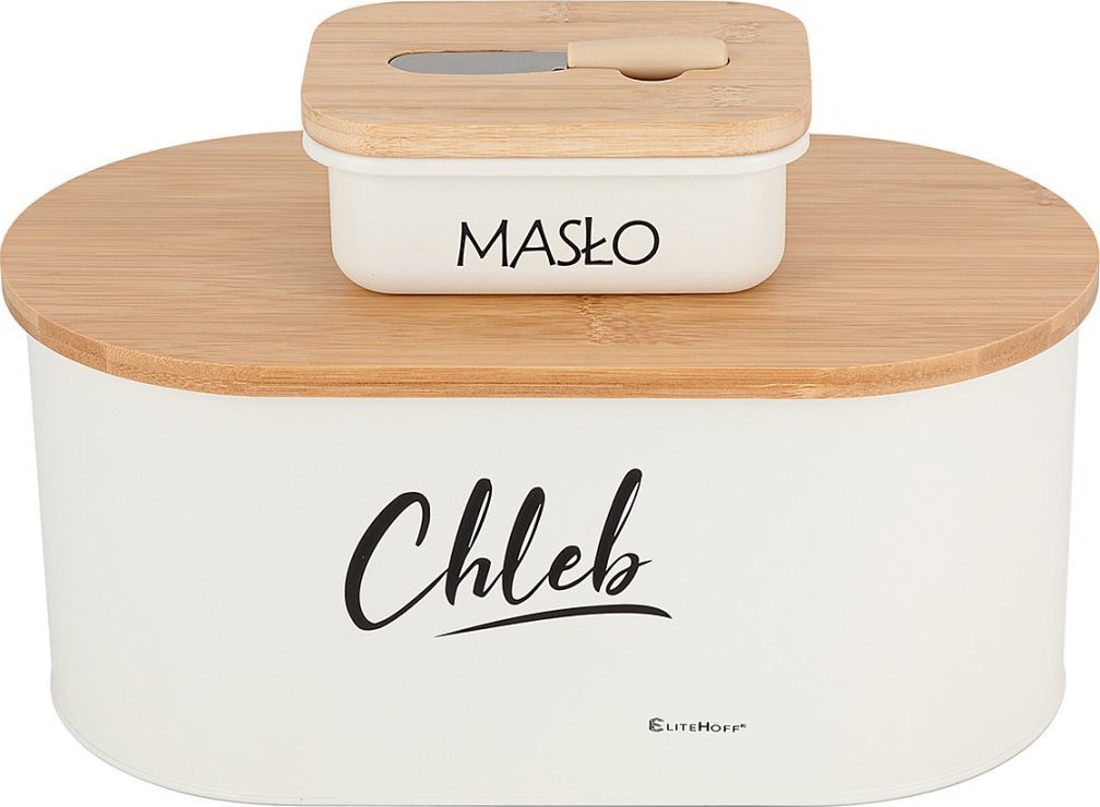 Chlebak kuchenny przyda się wszystkim tym, którzy chcą w odpowiedni sposób przechowywać pieczywo. Chlebak charakteryzuje się ciekawym, nowoczesnym designem. Pokrywa wykonana z drewna bambusowego może służyć również jako deska do krojenia. W zestawie znajduje się maselniczka z pokrywą bambusową oraz nożykiem do smarowania.