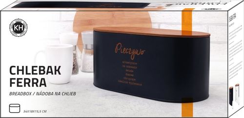 Granatowy chlebak Konighoffer Ferra 34 x 18 x 15 cm został wyprodukowany ze stali nierdzewnej. Model ma zamknięcie z drewna bambusowego. Pokrywa dobrze chroni zawartość przed zanieczyszczeniem i światłem. Może ona też zostać wykorzystana jako deska kuchenna do krojenia pieczywa. Produkt ma gustowne matowe wykończenie. Elegancji dodają mu polskie napisy w złotym kolorze. Pomieści chleb i bułki dla całej rodziny. To propozycja dla tych, którzy cenią sobie świeżość, chrupkość i aromat świeżego pieczywa oraz szukają solidnego chlebaka. Stabilnie ustawisz go na kuchennym blacie.