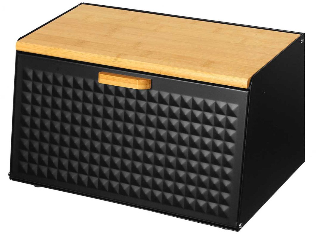 Chlebak stalowo-drewniany marki Brunbeste Korpus z lakierowanej stali nierdzewnej w kolorze czarnym. Górna pokrywa z jasnego drewna, przednia stalowa z drewnianym uchwytem. Możliwość otwarcia pokrywy przedniej lub górnej lub obu naraz. Łatwe otwieranie. Oszczędność miejsca. Przeznaczony do przechowywania wszelkiego rodzaju pieczywa. Atrakcyjny, nowoczesny design. Wykonany z wysokiej jakości materiałów. Opakowanie: kolorowy karton. Kolor: czarny/ jasne drewno. Wymiary chlebaka: 35,5 x 21,5(17) x 20cm ...