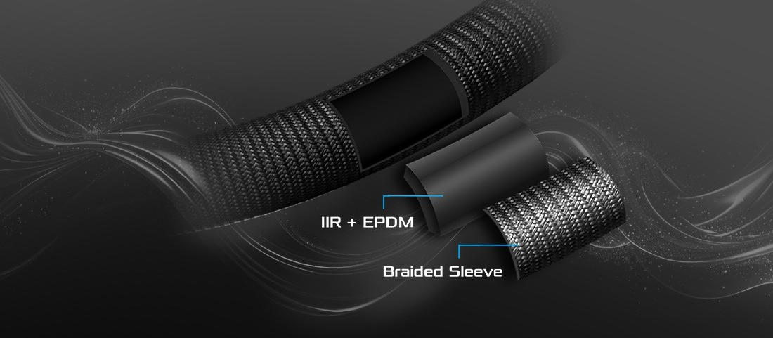 Przewody łączące blok z radiatorem zostały wykonane z mieszanki materiałów IIR oraz EPDM, co skutecznie zapobiega parowaniu chłodziwa i odkształceniom pod wpływem temperatury. Całość została zabezpieczona eleganckim plecionym rękawem, który nie tylko zwiększa wytrzymałość mechaniczną rurek, ale również nadaje im luksusowy wygląd. Elastyczność przewodów ułatwia ich prowadzenie wewnątrz obudowy, zapewniając porządek i swobodny przepływ powietrza.