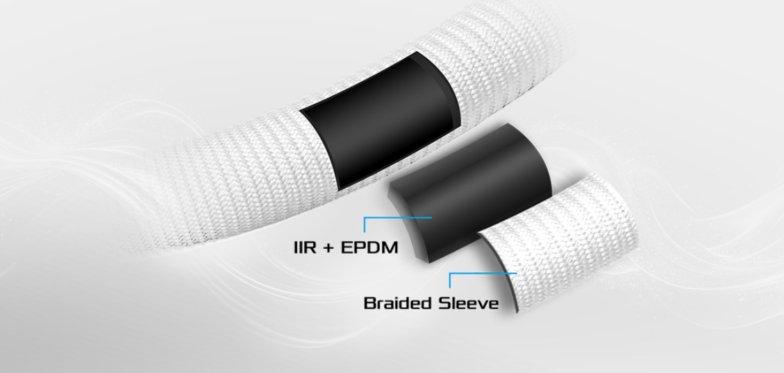 Przewody łączące blok z radiatorem zostały wykonane z mieszanki materiałów IIR oraz EPDM, co skutecznie zapobiega parowaniu chłodziwa i odkształceniom pod wpływem temperatury. Całość została zabezpieczona eleganckim plecionym rękawem, który nie tylko zwiększa wytrzymałość mechaniczną rurek, ale również nadaje im luksusowy wygląd. Elastyczność przewodów ułatwia ich prowadzenie wewnątrz obudowy, zapewniając porządek i swobodny przepływ powietrza.
