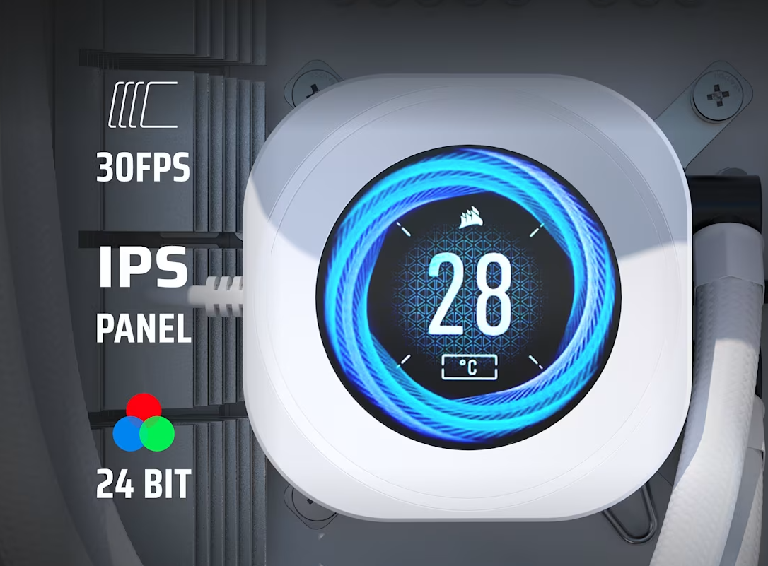 Wyświetla temperaturę procesora, animowane GIF-y, memy lub logo zespołu na wyrazistym ekranie 480 x 480 IPS przy prędkości 30 FPS z ultrajasnym podświetleniem 600 cd/m² i ponad 16,7 milionami kolorów. Oprogramowanie iCUE zawiera pełną integrację GIPHY w aplikacji, dając dostęp do tysięcy ulubionych memów i GIF-ów.