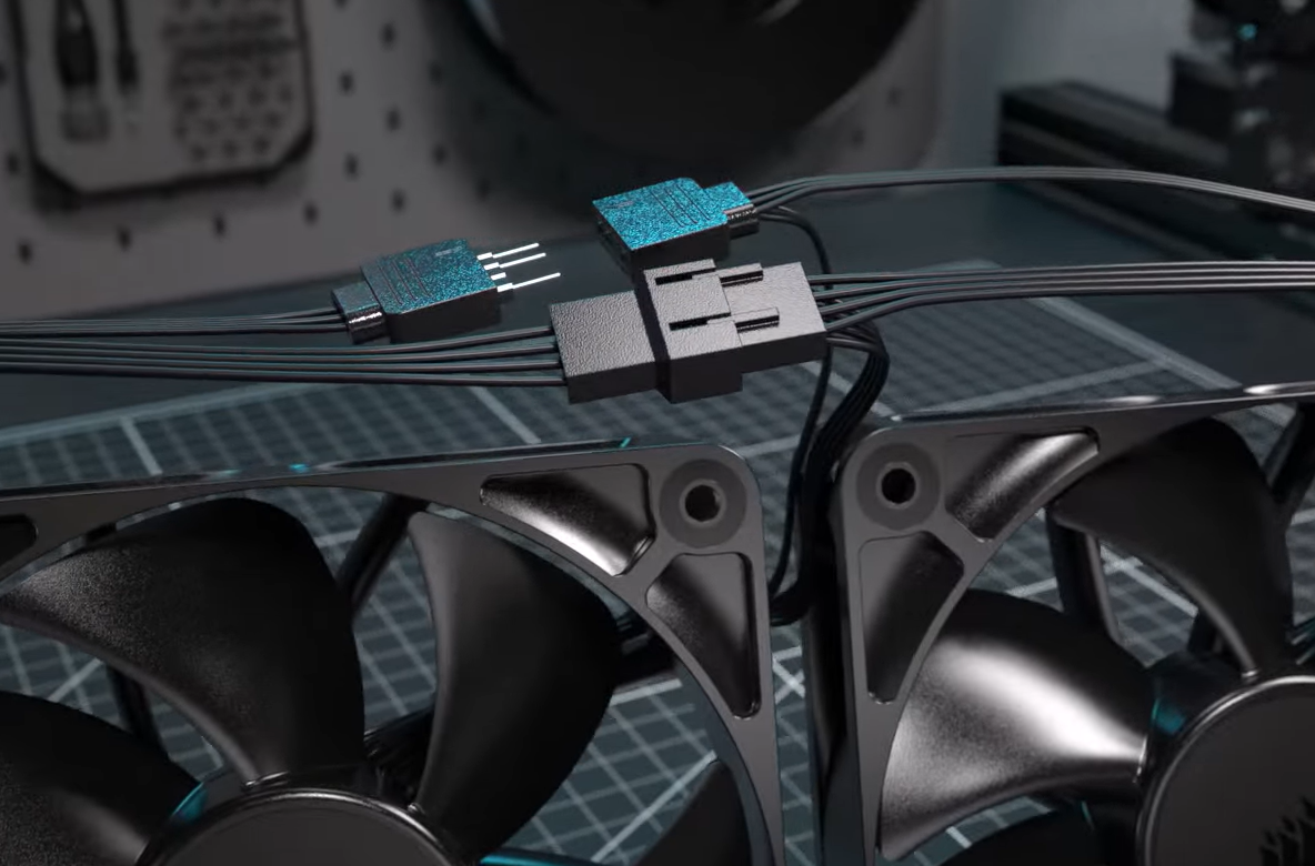 Zminimalizuj plątaninę przewodów w zestawie, łącząc łańcuchowo wentylatory RS z jednym, 4-pinowym złączem PWM na płycie głównej.