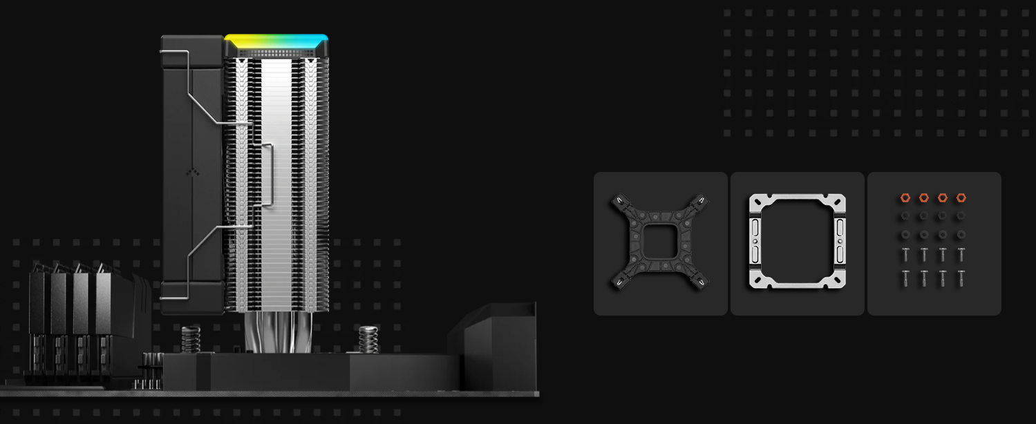 Ulepszony sposób instalacji jest łatwy dzięki solidnemu, w całości metalowemu wspornikowi montażowemu i szybkiemu, pięciostopniowemu procesowi, który pozwala bezpiecznie zamocować cooler na wielu platformach obsługujących najnowsze rozwiązania firm Intel i AMD.