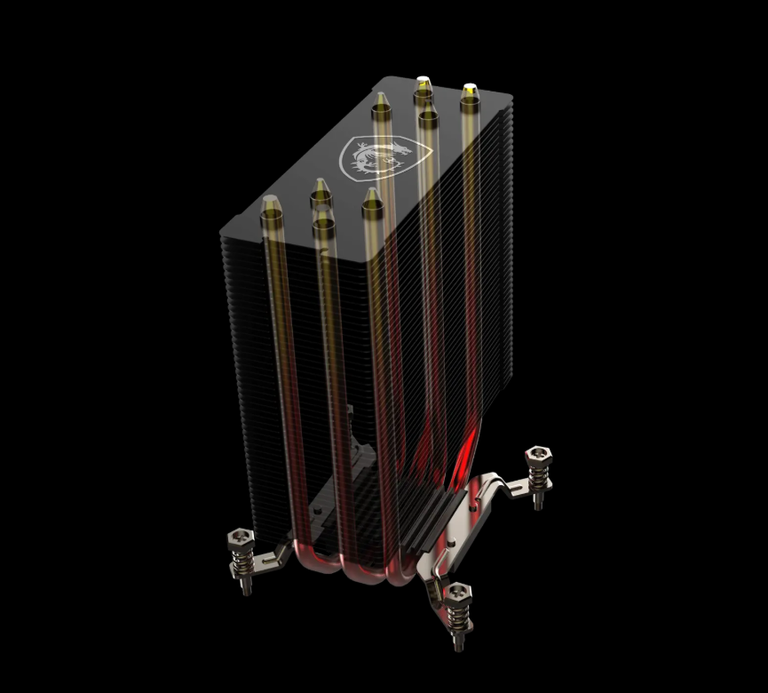 Na górnej pokrywie zestawu chłodzenia znajduje się precyzyjnie, laserowo wygrawerowany emblemat smoka MSI, MSI Dragon, który podkreśla kultowe detale i kunszt wykonania.