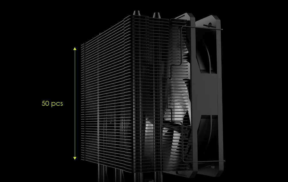 Radiator wyposażony jest w 50 ciasno upakowanych, jedno nad drugim, żeberek chłodzących, które charakteryzują się niskim oporem przepływu powietrza. Taka kombinacja cech przekłada się na dużo bardziej skupiony przepływ powietrza, zwiększoną wydajność chłodzenia i cichszą pracę.