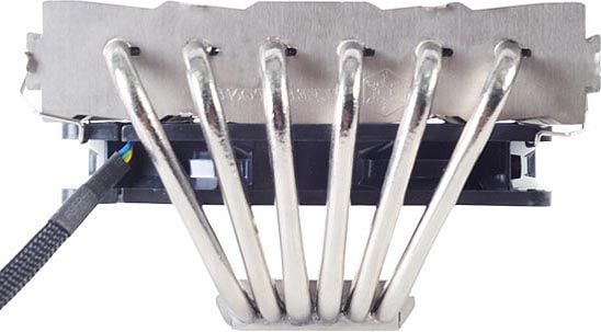 Klasyczna chłodnica z górnym przepływem przekonuje sześcioma rurkami cieplnymi o grubości 6 mm i pomimo bardzo małej wysokości wynoszącej zaledwie 82 mm nadaje się nawet do małych obudów HTPC i chłodzi procesor całkowicie bezgłośnie, w zależności od konstrukcji, dostarczany 120 lub nawet drugi opcjonalny wentylator 120 mm. Aktywne chłodzenie wspomaga również odprowadzanie ciepła z żeberek w dolnej części chłodnicy, dzięki czemu ciepło może być skutecznie rozpraszane.