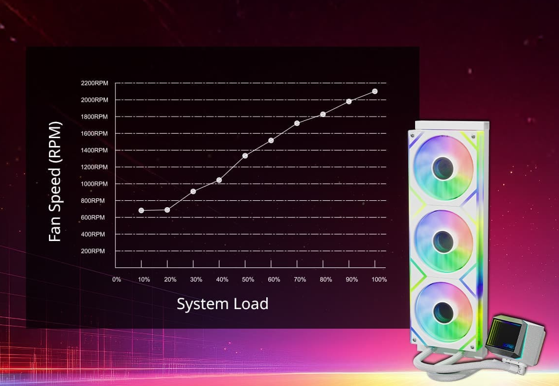 Dzięki sterowaniu PWM wstępnie zainstalowanymi wentylatorami i pompą system dostosowuje cykl pracy w zależności od temperatury podzespołów, optymalizując efektywność energetyczną i minimalizując zużycie energii. Ta inteligentna konstrukcja odpowiada za precyzyjne chłodzenie przy prędkości wentylatorów sięgającej w razie potrzeby 2000 obr./min (±10%), zapewniając jednocześnie cichą pracę przy mniejszych obciążeniach oraz idealną równowagę między wydajnością, skutecznością i stabilnością systemu.