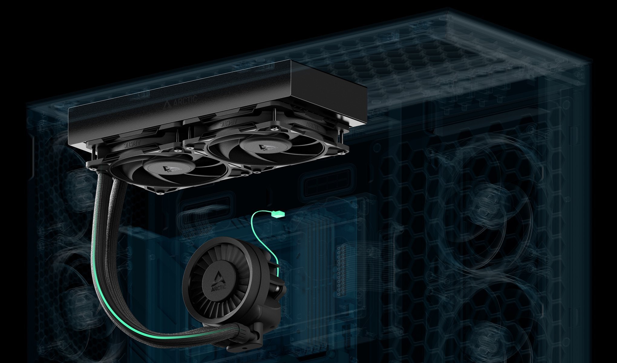 Za pomocą kabla rozdzielającego pompę, wentylator VRM i wentylatory radiatora można sterować oddzielnie lub zsynchronizować za pomocą jednego sygnału PWM z kablem all-in-one. Przed instalacją sprawdź kompatybilność obudowy – Liquid Freezer wymaga co najmniej 63 mm przestrzeni.