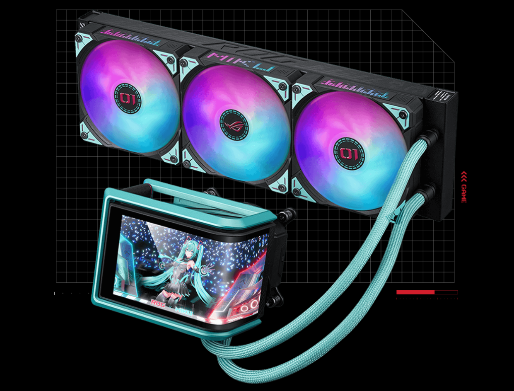 ROG Ryuo IV 360 ARGB Hatsune Miku Edition posiada 6,67-calowy wyświetlacz AMOLED, umożliwiający intuicyjne sterowanie za pomocą dedykowanego oprogramowania i płynne wyświetlanie filmów 3D, spersonalizowanej zawartości lub informacji o sprzęcie. Innowacyjny, zakrzywiony ekran przekracza granice między światem wirtualnym a rzeczywistym. Wydajna pompa i wentylatory ROG ARGB zapewniają stabilne chłodzenie procesorów, w tym serii AMD Ryzen™ 9000 oraz Intel® Core™ Ultra.