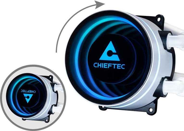 Blok wodny chłodzenia Chieftec Iceberg White 240 wyposażono w popularny efekt „infinity mirror” (lustra nieskończoności), który oferuje głęboki i dynamiczny efekt wizualny podświetlenia ARGB. Dodatkowym atutem jest możliwość obracania logo CHIEFTEC o 240 stopni, co pozwala na idealne dopasowanie estetyczne niezależnie od orientacji montażu bloku na płycie głównej. W połączeniu z podświetleniem wentylatorów, całość tworzy spójny i widowiskowy system chłodzenia, który można zsynchronizować z innymi komponentami ARGB w komputerze.