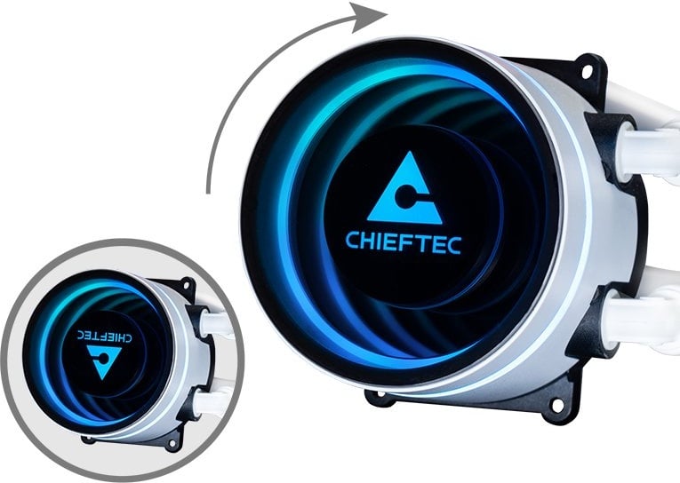 Blok wodny chłodzenia Chieftec Iceberg White 360 wyposażono w popularny efekt „infinity mirror” (lustra nieskończoności), który oferuje głęboki i dynamiczny efekt wizualny podświetlenia ARGB. Dodatkowym atutem jest możliwość obracania logo CHIEFTEC o 360 stopni, co pozwala na idealne dopasowanie estetyczne niezależnie od orientacji montażu bloku na płycie głównej. W połączeniu z podświetleniem wentylatorów, całość tworzy spójny i widowiskowy system chłodzenia, który można zsynchronizować z innymi komponentami ARGB w komputerze.