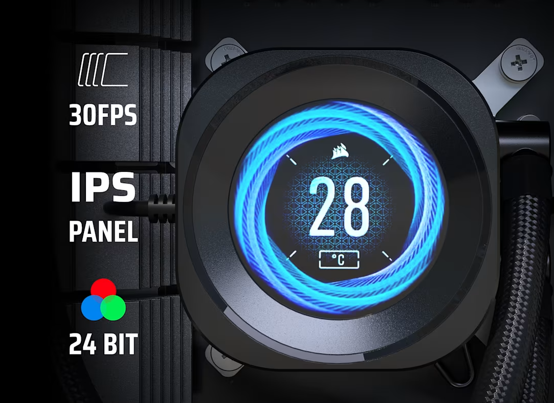 Wyświetla temperaturę procesora, animowane GIF-y, memy lub logo zespołu na wyrazistym ekranie 480 x 480 IPS przy prędkości 30 FPS z ultrajasnym podświetleniem 600 cd/m² i ponad 16,7 milionami kolorów. Oprogramowanie iCUE zawiera pełną integrację GIPHY w aplikacji, dając dostęp do tysięcy ulubionych memów i GIF-ów.