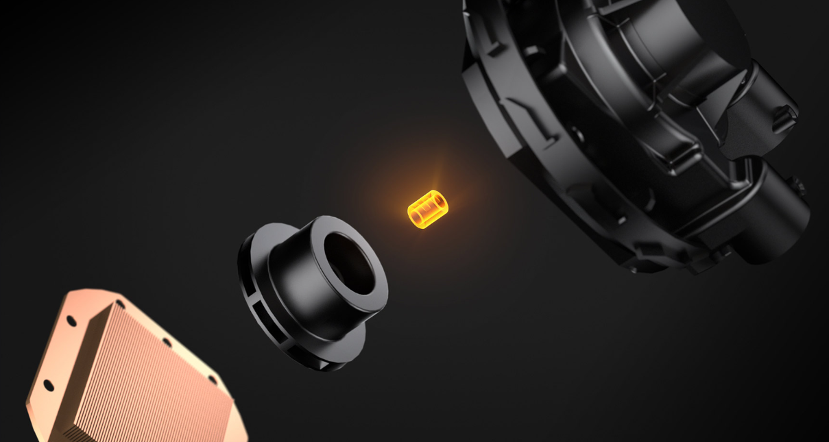 Głowica pompy z oświetleniem ARGB i lustrzanym odbiciem nieskończoności nadaje komputerowi estetykę, zamieniając go w niesamowite dzieło sztuki.