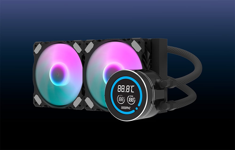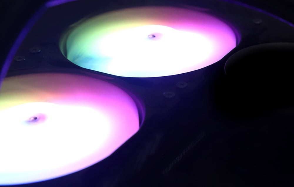 Chłodzenie Darkflash DN-D240 wyposażone jest w dwa wysokowydajne wentylatory 120 mm z funkcją PWM, które automatycznie dostosowują swoją prędkość obrotową w zakresie od 800 do 1800 RPM w zależności od obciążenia procesora. Wentylatory wykorzystują łożyska hydrauliczne, co wydłuża ich żywotność do 40 000 godzin i zapewnia cichą pracę przy maksymalnym przepływie powietrza 61,7 CFM. Podświetlenie ARGB pozwala na synchronizację kolorów i efektów wizualnych z innymi komponentami.