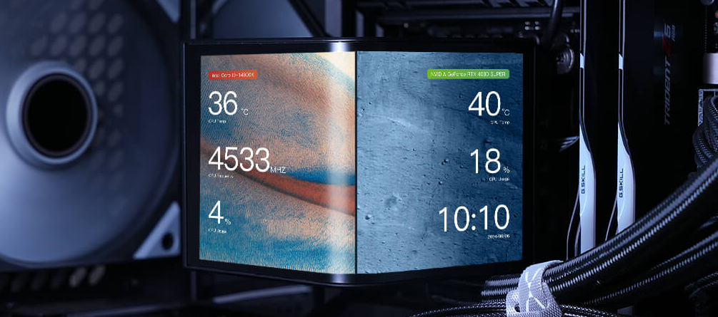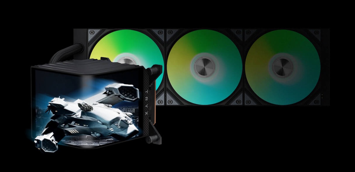 System chłodzenia cieczą TRYX Panorama ARGB 360 Black wyróżnia się na tle konkurencji innowacyjnym, 6,67-calowym, zakrzywionym ekranem AMOLED. To pionierskie rozwiązanie sprawia, że jest to pierwsze urządzenie All-In-One (AIO) z ekranem w kształcie litery L. Ekran ten oferuje wyjątkowo szeroki kąt widzenia, co pozwala na wygodne monitorowanie danych i podziwianie efektów wizualnych niemal z każdej perspekty Wyjątkowa konstrukcja łączy estetykę z funkcjonalnością, tworząc centralny, przyciągający wzrok element w każdej obudowie komputera.