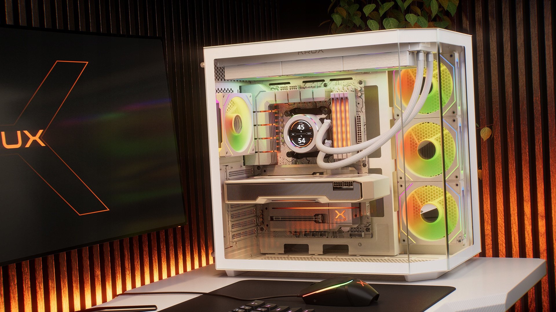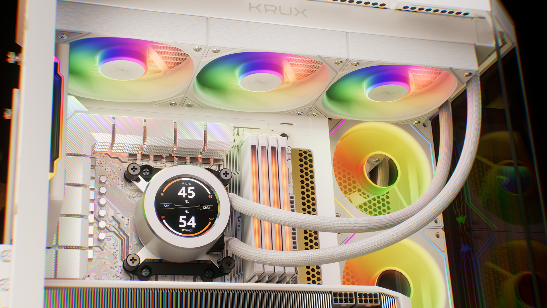 Za cyrkulację powietrza odpowiadają 3 preinstalowane wentylatory Krux 120 White PWM ARGB z łożyskami HBS, podświetleniem i sterowaniem PWM. Zapewniają wysoką wydajność chłodzenia przy niskim poziomie generowanego dźwięku oraz pełną możliwość personalizacji kolorów i efektów świetlnych po podłączeniu do kompatybilnej płyty głównej lub kontrolera ze złączem 3-pin ARGB.