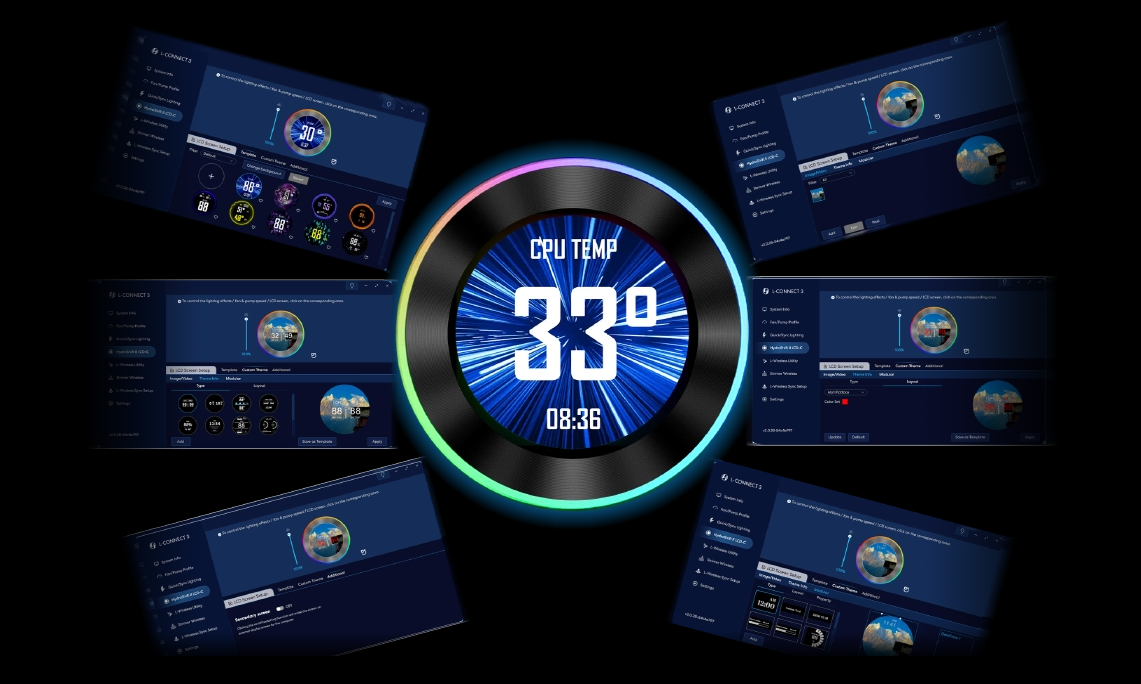 Wyświetlaj wartości czujników na żywo, animowane motywy, a nawet krótkie pliki MP4 na centralnym wyświetlaczu IPS. Sterowanie odbywa się bezprzewodowo za pomocą kontrolera L-Wireless lub przez USB za pomocą L-Connect 3 – nie ma potrzeby ponownego podłączania ani instalowania oprogramowania.