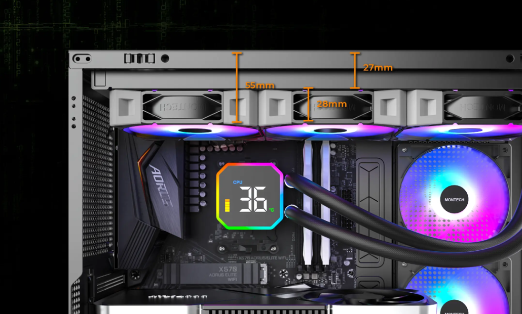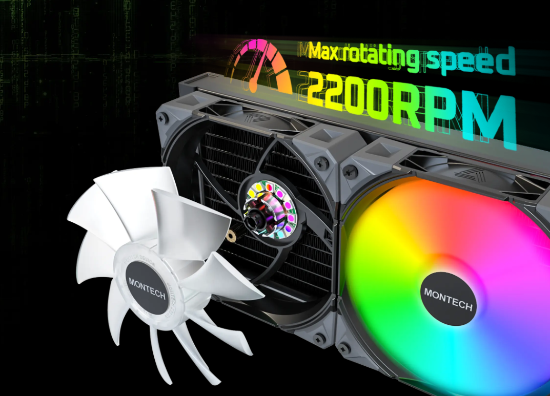 W zestawie znajdują się wysokiej klasy wentylatory Montech Metal Pro, które charakteryzują się zoptymalizowanym kształtem łopatek dla maksymalnego ciśnienia statycznego. Wyposażone są one w łożyska typu Fluid Dynamic Bearing, co przekłada się na wysoką kulturę pracy oraz przedłużoną żywotność mechanizmu. Pełne wsparcie dla adresowalnego podświetlenia RGB pozwala na synchronizację efektów świetlnych z resztą podzespołów komputera. Wentylatory te skutecznie przedmuchują radiator, zachowując przy tym niski poziom generowanego hałasu.