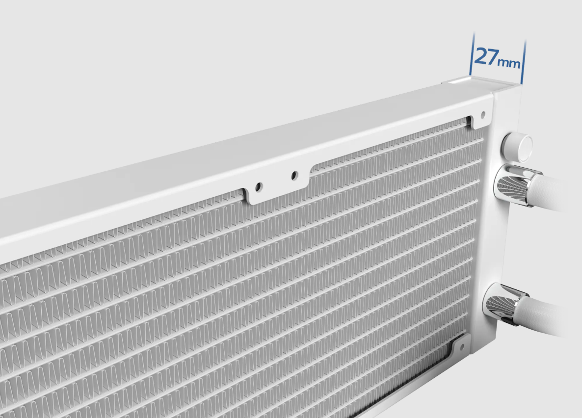 Radiator o wymiarach 397 x 120 x 27 mm wykonany z aluminium został zaprojektowany pod kątem maksymalnej efektywności odprowadzania ciepła. Jego konstrukcja, charakteryzująca się grubością 27 mm oraz współczynnikiem użebrowania 20 FPI (żeber na cal), pozwala na skuteczne schłodzenie nowoczesnych, wysokowydajnych procesorów. Dzięki tej optymalizacji, chłodzenie bez problemu radzi sobie z intensywnymi zadaniami, takimi jak rendering czy długie sesje gamingowe.