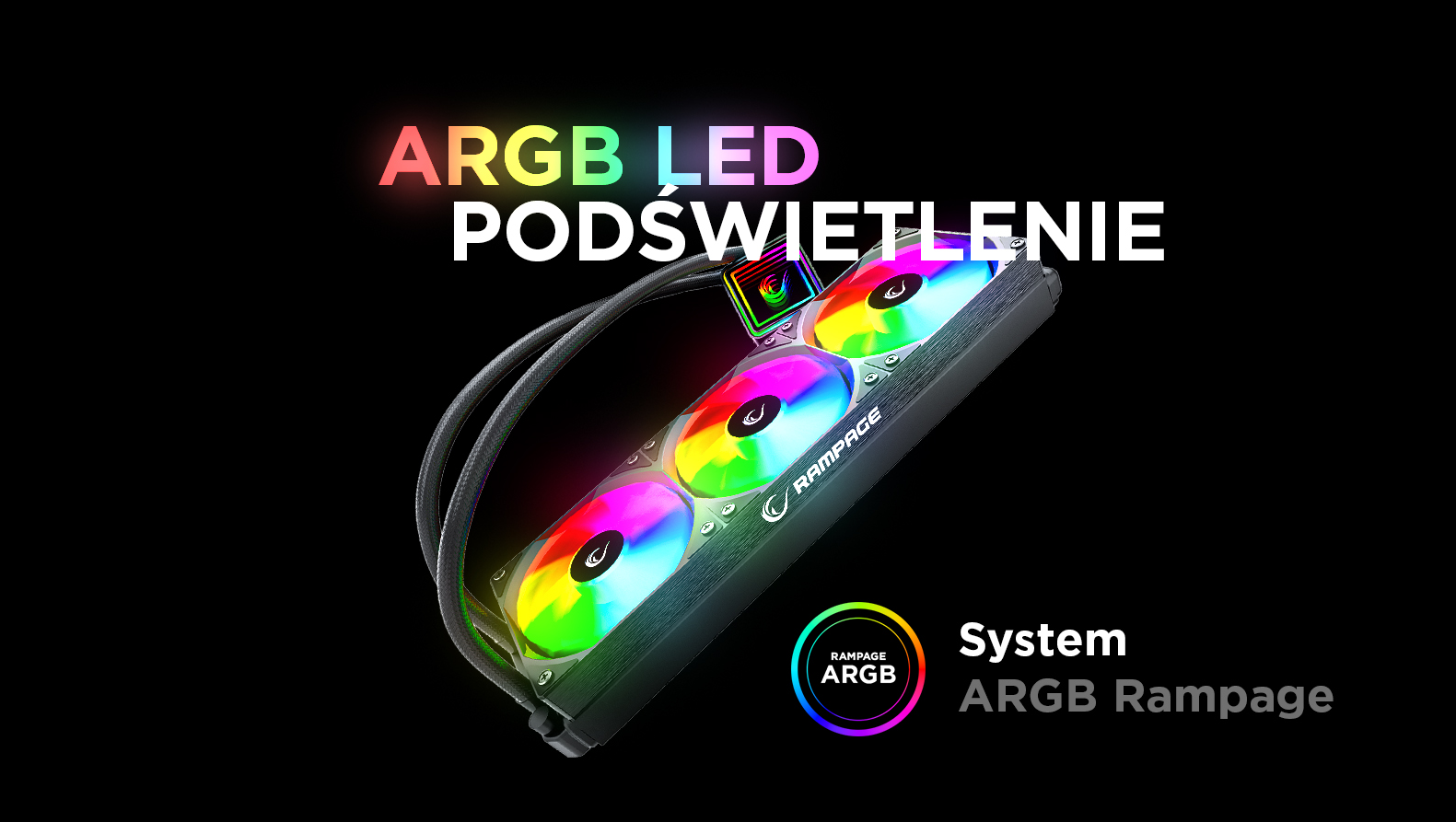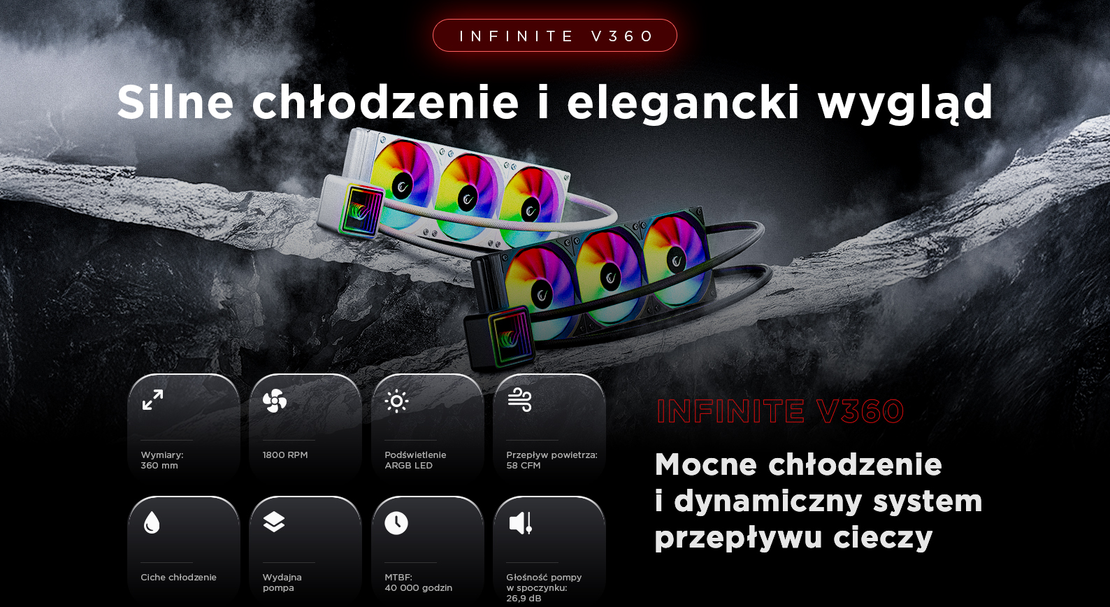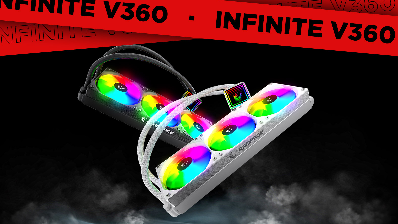 Rampage INFINITE V360 to zestaw chłodzenia wodnego AIO dla graczy, którzy chcą maksymalnej wydajności, nowoczesnego designu i opcji personalizacji. Trzy wentylatory, radiator 360 mm i adresowalne ARGB robią wrażenie – zarówno pod względem temperatur, jak i stylu.