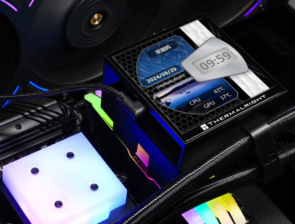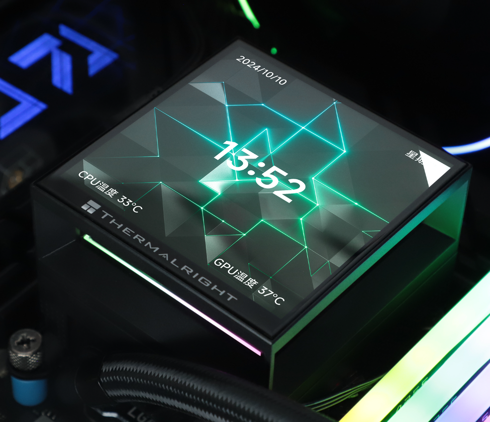 Jedną z najbardziej wyróżniających się cech tego chłodzenia jest wbudowany w blok wodny ekran LCD o przekątnej 3,95 cala. Ekran, montowany magnetycznie, pozwala na wyświetlanie kluczowych parametrów pracy komputera, takich jak temperatura procesora czy prędkość wentylatorów. Dzięki rozdzielczości 480 x 480 pikseli i panelowi IPS, wyświetlany obraz jest wyraźny i ma żywe kolory. Użytkownik może personalizować zawartość ekranu, dodając własne grafiki lub animacje, co pozwala na stworzenie unikalnego wyglądu zestawu komputerowego.