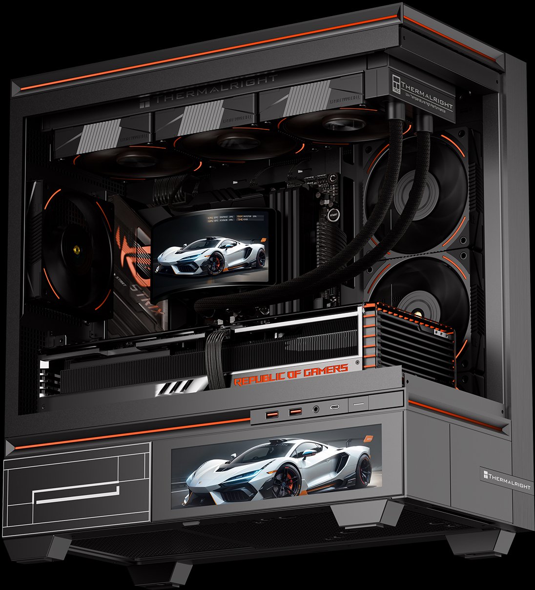 Chłodzenie wodne Thermalright Rainbow Vision 360 Turbo ARGB BLACK wyróżnia się charakterystycznym, agresywnym wzornictwem. Połączenie czarnych elementów z dynamicznym podświetleniem ARGB nadaje mu nowoczesnego, wręcz futurystycznego wyglądu. To jednak potężny ekran LCD stanowi główny punkt wizualny konstrukcji — jego rozmiar i proporcje sprawiają, że blokopompka wygląda jak panel sterujący rodem z wysokiej klasy urządzeń. Dzięki temu zestaw świetnie sprawdzi się w obudowach z bokami z hartowanego szkła czy w projektach, gdzie liczy się efekt wizualny.