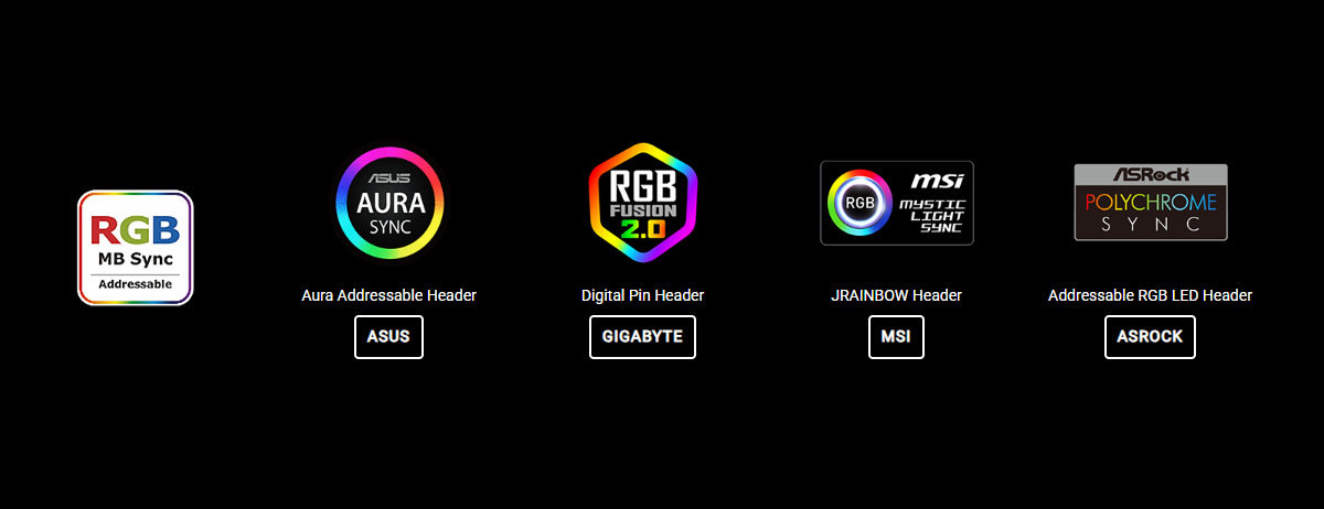System został zaprojektowany do pełnej synchronizacji z technologiami: ASUS Aura Sync, GIGABYTE RGB Fusion, MSI Mystic Light Sync oraz ASRock Polychrome. Obsługuje płyty główne wyposażone w adresowalne złącze RGB 5V, co pozwala na sterowanie podświetleniem bezpośrednio z poziomu dedykowanego oprogramowania producenta płyty, bez konieczności instalowania dodatkowych aplikacji czy kontrolerów. Więcej informacji można znaleźć na oficjalnych stronach internetowych firm ASUS, GIGABYTE, MSI i ASRock.