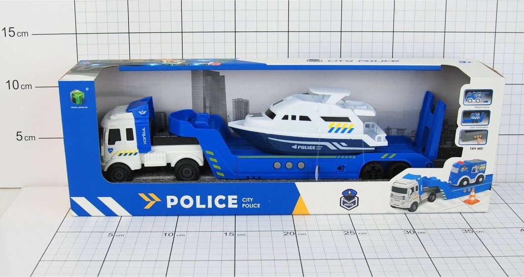 W zależności od zestawu na naczepie znajduje się: łódz policyjna, koparka, pojazd strażacki i helikopter