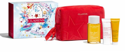 Clarins Set : Tonic, Firming, Body Oil, 100 ml + Exfoliating, Body Scrub, 30 ml + Tonic, Hydrating, Body Balm, Body, 30 ml + GWP Textile Pouch, Red For Women