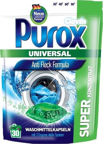 Kapsułki do prania Purox Universal to innowacyjny produkt do prania. Kapsułki są wyjątkowo wygodne w użytkowaniu, ponieważ każda zawiera odpowiednią ilość produktu, zapewniając optymalne, skuteczne pranie. Skoncentrowana formuła żelu pozwala usunąć uporczywe plamy. Za czystość ubrań odpowiadają aż 3 aktywne enzymy: amylaza, proteaza i celulaza, usuwając najtrudniejsze zabrudzenia różnego rodzaju. Aktywny tlen i wybielacz optyczny pozwalają nadać białym ubraniom olśniewającą świeżość i zapobiegają szarzeniu. Składniki chroniące przed przenoszeniem się barwników między tekstyliami sprawiają, że kapsułki są szczególnie polecane do prania kolorowego. Ponadto pozwalają zachować żywość barw. Żelowa formuła zawarta w kapsułkach sprawia, że produkt doskonale rozpuszcza się w czasie praniu.