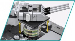 Model z klocków konstrukcyjnych COBI w skali 1:300 to prawdziwe wyzwanie dla wszystkich budowniczych. Składa się z 2655 elementów i wymaga kilku godzin intensywnego i emocjonującego składania. Ma dokładnie 92 cm (36.2") długości i 20,5 cm (8") wysokości. Posiada ruchome elementy takie jak wieże artyleryjskie i lufy dział, śruby napędowe czy ster. Wysokiej jakości nadruki umożliwiły uchwycenie jeszcze większej ilości detali, które sprawiają, że klockowy okręt wygląda bardzo atrakcyjnie! Dzięki intuicyjnej instrukcji opartej na czytelnych ikonach budowa jest prosta i nie sprawia problemu. Do zestawu dołączona jest specjalna klockowa podstawka ekspozycyjna z nadrukowaną na tabliczce nazwą okrętu. Okręt prezentuje się na niej niezwykle okazale, nikt nie przejdzie obok niego obojętnie! Legendarny już USS Missouri będzie wyjątkową ozdobą każdej kolekcji pasjonata historii, marynistyki i militariów. Buduj historię, klocek po klocku!