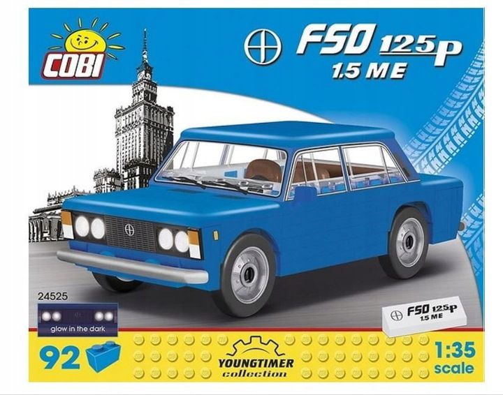 FSO 125p 1,5 ME to samochód osobowy klasy średniej produkowany w Fabryce Samochodów Osobowych na Warszawskim Żeraniu. Nazywany jest potocznie Dużym Fiatem. W styczniu 1986 roku rozpoczęto produkcję zmodernizowanej wersji 125p pod oznaczeniem 1,5 ME. Była to wersja ekonomiczna wyposażona w pakiet zmian mających na celu maksymalną oszczędność paliwa. Zaledwie kilkadziesiąt lat temu ten pojazd był obiektem zazdrości wielu fanów motoryzacji. Model w skali 1:35 złożony w 100% z klocków COBI bardzo wiernie oddaje charakterystyczne kształty oryginalnego FSO 125p w wersji 1,5 ME. Dzięki 92 elementom możliwe są drobne modyfikacje i przeróbki pojazdu. W modelu tym zrezygnowaliśmy z naklejek. Zostały one zastąpione trwałymi nadrukami, które nie ścierają się nawet w trakcie intensywnej zabawy. Obracające się koła wyposażone w opony idealnie nadają się do poruszania modelem w trakcie zabawy. Model z klocków konstrukcyjnych COBI będzie w pokoju dziecięcym nie tylko zabawką, ale również przyczyni się do zainteresowania historią motoryzacji. Z pewnością pomoże rozwinąć zdolności motoryczne dzieci oraz podniesie umiejętności konstrukcyjne. Dla dorosłych fanów klocków będzie to piękny model historycznego pojazdu oraz być może zaczątek przyszłej kolekcji. | ![]() |