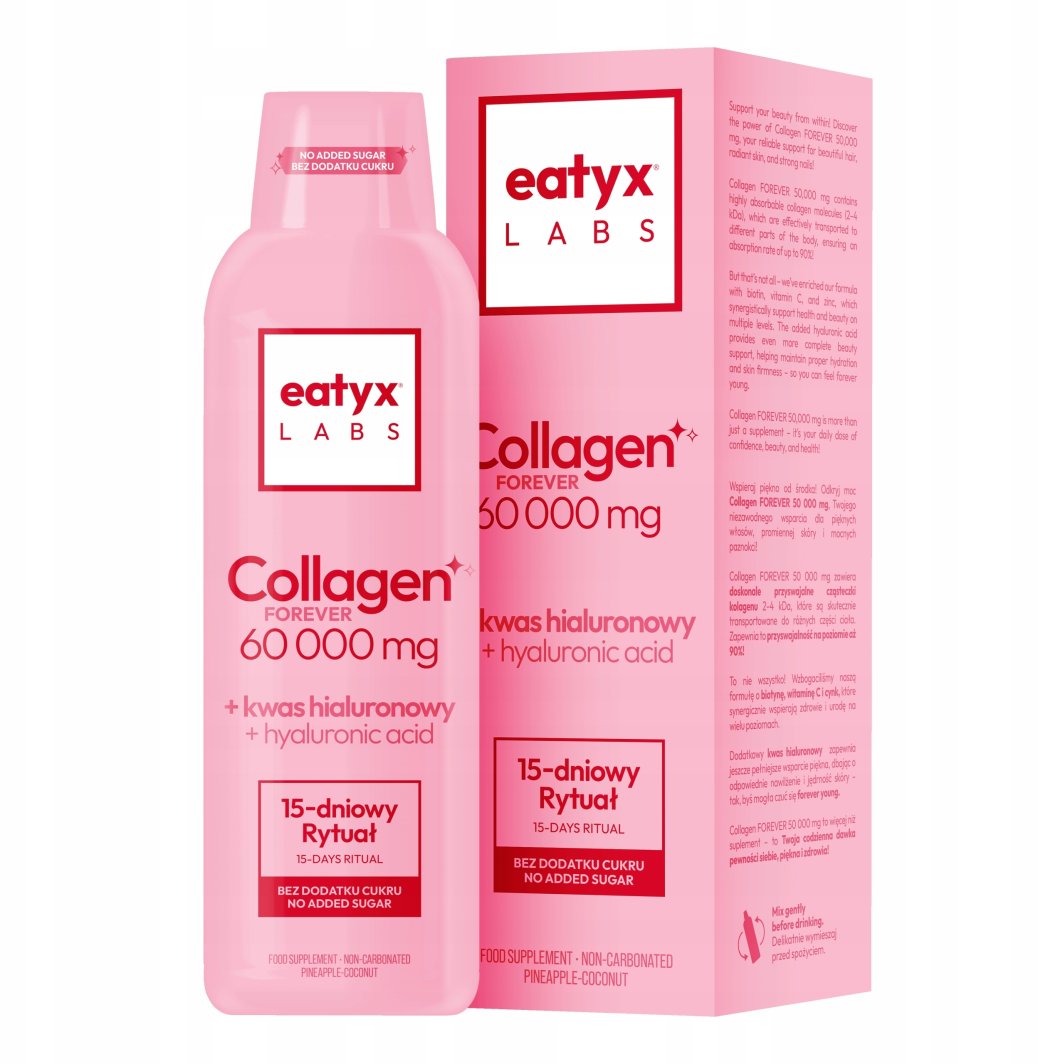EATYX Collagen Forever 60000mg to nowoczesny suplement diety w płynnej formie, który dostarcza organizmowi kluczowych składników wspierających zdrowie skóry, włosów oraz paznokci. Dzięki wysokiej zawartości hydrolizowanego kolagenu wołowego, ten produkt stanowi doskonałe rozwiązanie dla osób pragnących zadbać o swoją urodę od wewnątrz.