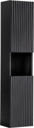 Słupek łazienkowy NOVA BLACK D 80-03-2D dwudrzwiowy z półkami Szafka łazienkowa NOVA BLACK 80-03-2D to doskonałe rozwiązanie dla osób ceniących elegancję i funkcjonalność w swojej łazience. Ta wisząca szafka zachwyca nowoczesnym wyglądem, który doskonale wpisuje się w trendy współczesnych wnętrz. Czarne ryflowane fronty z płyty MDF nadają szafce wyjątkowego charakteru, dzięki czemu staje się ona eleganckim akcentem każdej łazienki. Dwudrzwiowa szafka z kolekcji mebli modułowych NOVA stanowi perfekcyjne połączenie nowoczesnego designu z praktycznym zastosowaniem. Szafka oferuje mnóstwo miejsca do przechowywania, dzięki czemu w łatwy sposób zachowasz ład i porządek w swojej łazience. Każda z półek może wytrzymać obciążenie do 5 kg, co pozwala na wygodne przechowywanie różnorodnych kosmetyków i akcesoriów łazienkowych. Wykonana z wysokiej jakości materiałów, takich jak fronty z płyty MDF oraz trwały korpus z płyty laminowanej, które są odporne na wilgoć i uszkodzenia mechaniczne, co jest kluczowe w warunkach łazienkowych. Czarne, eleganckie wykończenie dodaje łazience szyku i klasy, a frezowany pochwyt oraz zawiasy z cichym domykiem sprawiają, że korzystanie z niej jest wyjątkowo komfortowe. Wysoki słupek świetnie łączy się z innymi modelami i kolorami mebli z kolekcji NOVA, co umożliwia stworzenie spersonalizowanego zestawu mebli łazienkowych. Szeroki wybór modeli pozwala na dopasowanie mebli do indywidualnych potrzeb i preferencji, tworząc spójną i harmonijną aranżację łazienki. Szafkę możesz zamówić również w wersji z dodatkową półką Qubik w kolorze naturalnego dębu widoczną na zdjęciu aranżacyjnym, dostępną w opcjach dodatkowych. Ta dodatkowa półka doskonale wpasuje się w otwartą przestrzeń szafki, tworząc wyjątkową kompozycję. Szafka NOVA BLACK 80-03-2D wyróżnia się ponadczasową formą, która nigdy nie wyjdzie z mody. Jej klasyczna, ale jednocześnie nowoczesna estetyka sprawia, że będzie wyglądać stylowo przez wiele lat. Cechy produktu: wysoka szafka wisząca, szafka dwudrzwiowa, korpus 16 mm płyta laminowana, fronty z płyty MDF 16 mm, kolor czarny, ryflowane fronty, frezowane uchwyty, w opcji dodatkowej regał Qubik w kolorze naturalnego dębu, możliwość zamontowania drzwi na prawo lub lewo, cichy domyk, max. obciążenie półek po 5 kg, do samodzielnego montażu, w swojej ofercie posiadamy szeroki wybór mebli pozwalających na kompleksowe wyposażenie mieszkania.