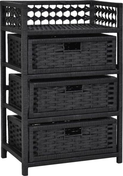 Regał łazienkowi z koszami i 4 półkamiDzięki 3 łatwo wysuwanym szufladom masz miejsce na akcesoria łazienkowe, suszarkę do włosów, ręczniki, lekarstwa, pastę do zębów, kremy itp. Ponadto na wierzchu możesz umieścić pudełko chusteczek lub inne akcesoria. Regalik jest absolutnie idealny do każdego rodzaju ciasnej przestrzeni, takiej jak małe łazienki, salony, jadalnie lub mieszkania.Kolor: czarnyIlość koszy: 3Wymiary kosza: 38 x 24 x 14 cmIlość półek: 4Wymiary półki: 39 x 25 x 14 cmWysokość mebla: 66 cmSzerokość mebla: 42,5 cmGłębokość mebla: 26 cmMateriał: drewno sosnowe + pleciony papier z linyWymiary uchwytu kosza: 7 x 3 cm...
