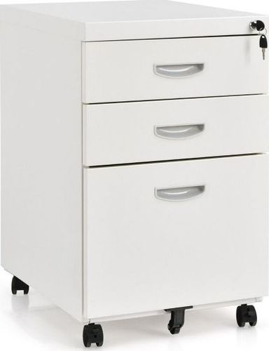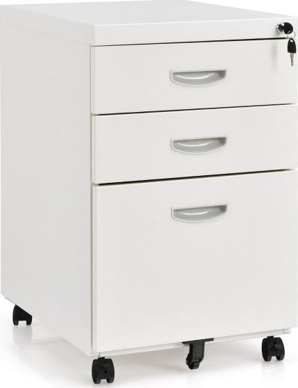 Szafka pod biurko z 3 szufladamiSzafka na dokumenty z 3 szufladami: Szafka na dokumenty to idealne rozwiązanie do utrzymania porządku w dokumentach biurowych bez zajmowania zbyt dużej powierzchni. 3 szuflady zapewniają dużo miejsca na pisma i akta w różnych formatach, a przestrzeń na górze to powierzchnia o wymiarach 40 x 50 cm, dzięki czemu świetnie nadaje się jako podstawa pod drukarkę, dekoracje i inne przedmioty.Wygodny organizer na dokumenty: Duża szuflada na dokumenty jest głęboka i posiada wyjmowany separator i idealnie sprawdza się do przechowywania listów, dokumentów prawnych i teczek formatu A4. Kiedy przychodzi do organizacji dokumentów szafka jest niezastąpioną pomocą w domu, biurze i innych miejscach pracy.Wielofunkcyjne kółka: Szafka została wyposażona w 5 obrotowych kółek, dzięki którym przesuwanie i dopasowanie szafki jest bezproblemowe. Dwa z kółek posiadają blokadę hamującą która pozwala na umiejscowienie szafki bez ryzyka przesuwania się. Dodatkowe kółko mocowane pod dużą szufladą zapewnia stabilność szafki gdy ta szuflada jest maksymalnie wysunięta.Wyselekcjonowane materiały: Solidne materiały i trwała konstrukcja zapewniają szafce długowieczność. Przemyślane rozłożenie kółek i stabilna budowa pozwalają kłaść na szafce nawet ciężkie przedmioty bez ryzyka chybotania. Ponadto gładka powierzchnia jest odporna na zarysowana.System zamykania i gładkie prowadnice: Dokumenty to często bardzo istotne i poufne dane. Z tego powodu wyposażyliśmy nasza szafkę w dwa klucze zapewniające bezpieczeństwo i prywatność Twoich dokumentów. Szuflady wysuwają się za pomocą metalowych prowadnic nie hałasując przy tym, dzięki czemu w miejscu pracy zachowane zostaje spokój i miła atmosfera. Dane szczegółoweWymiary:Szerokość: 40 cmGłębokość: 50 cmWysokość: 64,5 cmWymiary górnej szuflady: 33 x 46 x 8 cmNośność górnej szuflady: 10 kgWymiary dolnej szuflady: 33 x 43 x 52 cm Nośność dolnej szuflady: 20 kgWaga: 18,2 kg...