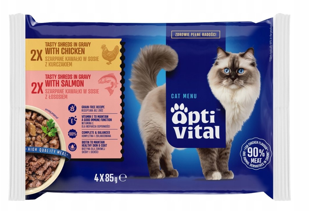 OptiVital saszetki to pełnoporcjowa karma stworzona z myślą o dorosłych kotach, dostępna w wygodnym opakowaniu 4x85g. Jej wyjątkowy smak kurczaka i łososia z pewnością przypadnie do gustu nawet najbardziej wybrednym mruczkom. Dzięki starannie dobranym składnikom, karma ta dostarcza niezbędnych wartości odżywczych, które wspierają zdrowie i witalność Twojego pupila.