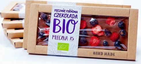SKŁADNIKIczekolada mleczna* (cukier trzcinowy*, tłuszcz kakaowy*, mleko w proszku pełne*, miazga kakaowa*, emulgator: lecytyna sojowa*), czarna porzeczka* (1,4%), truskawka liofilizowana* (1,4%) (*certyfikowany składnik ekologiczny)OPISMasa kakaowa minimum 38,8%. Czekolada robiona ręcznie. Zawiera liofilizowane czarne porzeczki i truskawki. WARTOŚĆ ODŻYWCZA W 100 gWartość energetyczna: 2402 kJ/ 577 kcalTłuszcz: 39 gw tym kwasy tłuszczowe nasycone: 24 gWęglowodany: 47 gw tym cukry: 46 gBłonnik: 3 gBiałko: 8 gSól: 0,19 gZALECANE WARUNKI PRZECHOWYWANIAPrzechowywać w temperaturze pokojowej. BEZ GLUTENU (w składnikach):BEZ GLUTENU (w składnikach) CERTYFIKAT BIO:jest Kraj Producenta:Polska Producent - nazwa i adres:CUKIERNIA "STAROPOLSKA" TOMASZ MACHOŃ, WÓLKA ABRAMOWICKA 47H, 20-388 LUBLIN WEGETARIAŃSKI:WEGETARIAŃSKI